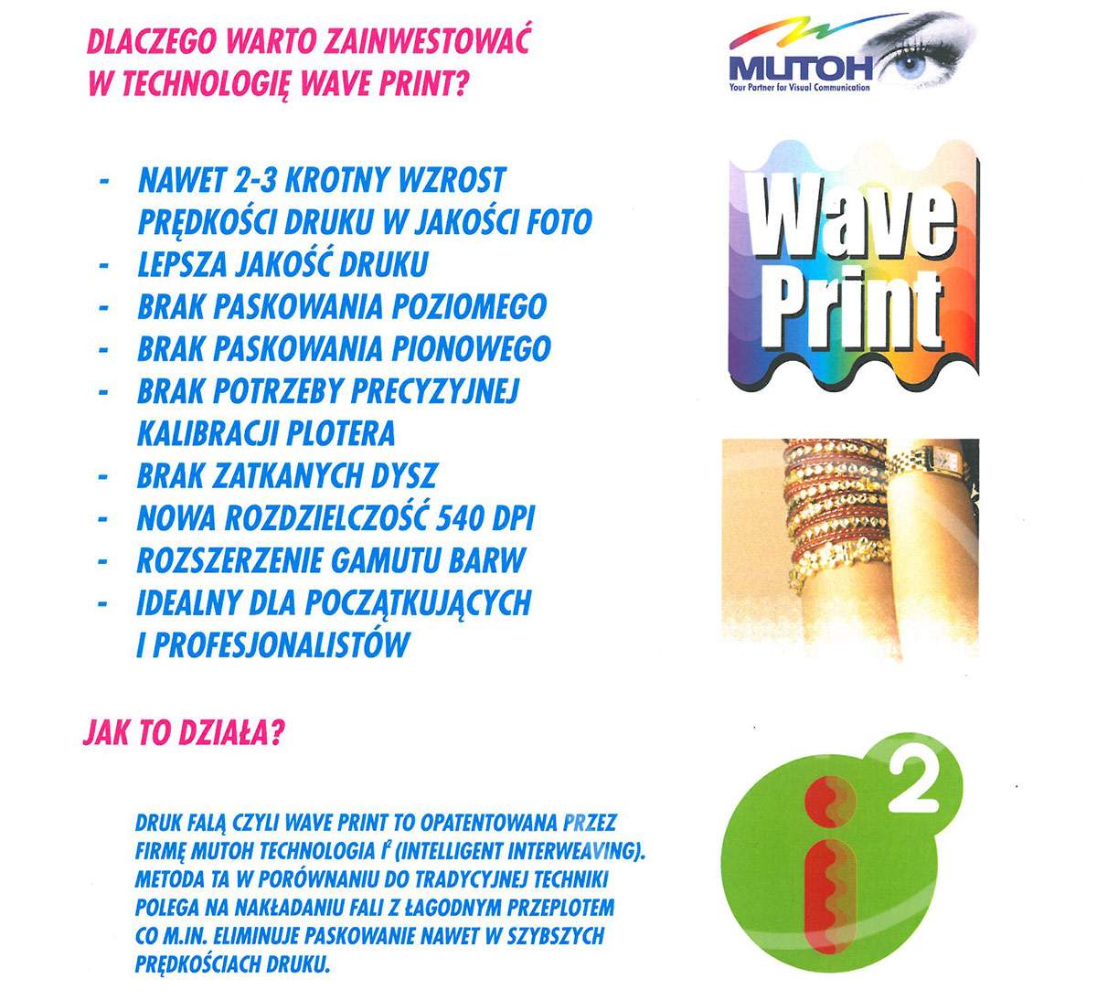Ploter ValueJet wyposażony jest w opatentowany system druku falą z przeplotem (ang. Intelligent Interweaving). Tradycyjna metoda druku wielkoformatowego polega na nakładaniu z każdym przebiegiem karetki kolejnych pasów. To rozwiązanie ma wadę. W momencie gdy ploter pozbawiony Intelligent Interweaving jest niedokładnie skalibrowany, często uzyskujemy efekt paskowania. Dlatego też Mutoh zastosował tę nową metodę druku we wszystkich swoich nowych ploterach. Dzięki temu w porównaniu do urządzeń innych producentów wyeliminowano paskowanie a także inne niepożądane efekty występujące podczas nakładania pasów. W momencie użycia profili kolorystycznych przygotowanych dla nowej metody zwiększamy osiągalny gamut kolorów a także ich intensywność.